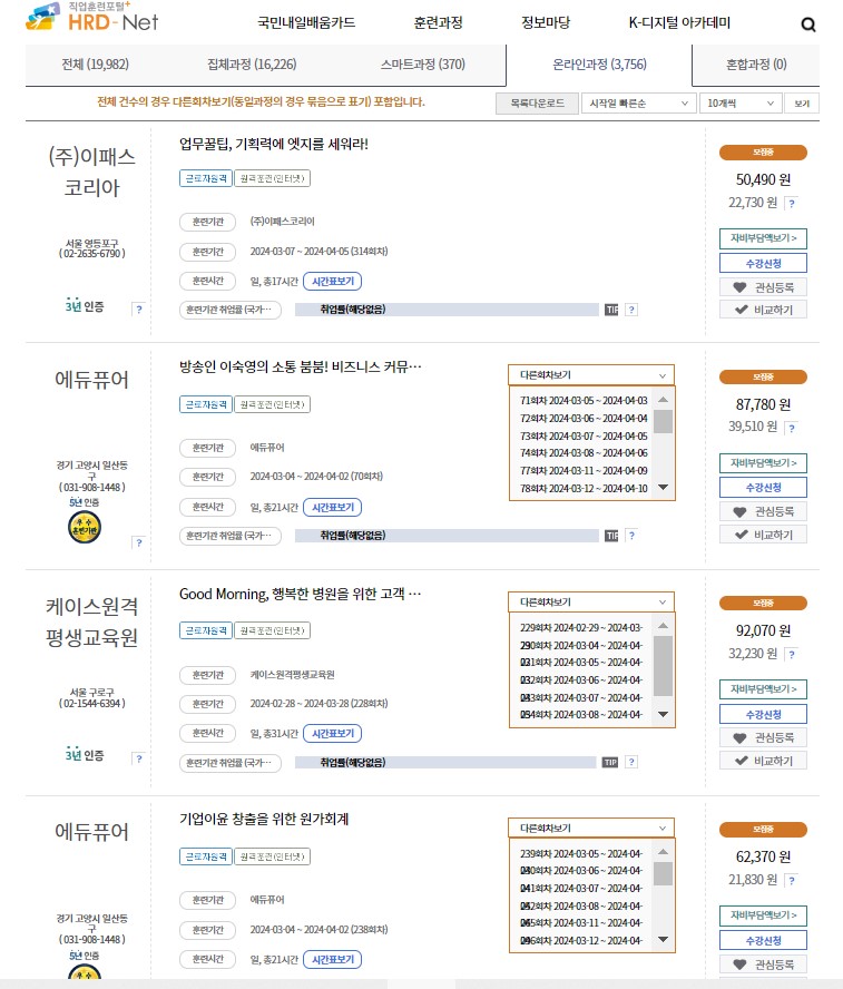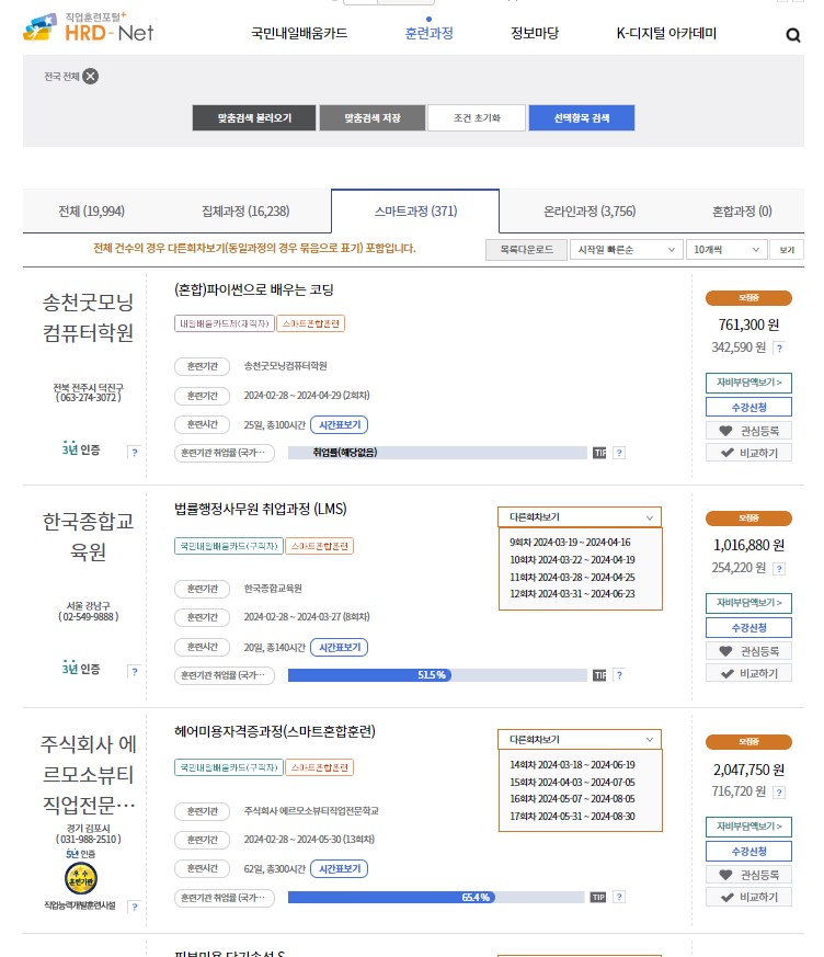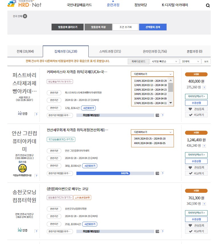 HRD-Net 홈페이지에서 로그인을 한 후 훈련과정 => 내일 배움 카드 훈련과정에서 확인해 볼 수 있습니다.