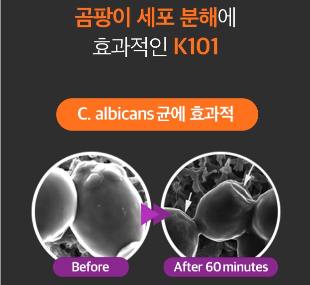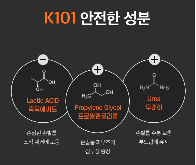 K101 조성물은 1. 흡습성(수분 증가와 각질을 용해), 2. 각질 용해(손발톱 환경 변화, 피부사상균의 성장 억제)
