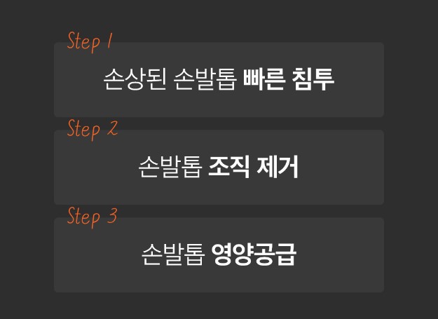 3. 항진균제(죽은 조직 부드럽게 제거, 손발톱 외관층 매끄럽게, 4. 강화(손발톱에 깊이 침투, 손발톱 강화)를 통해 손발톱을 강화시켜 줍니다.