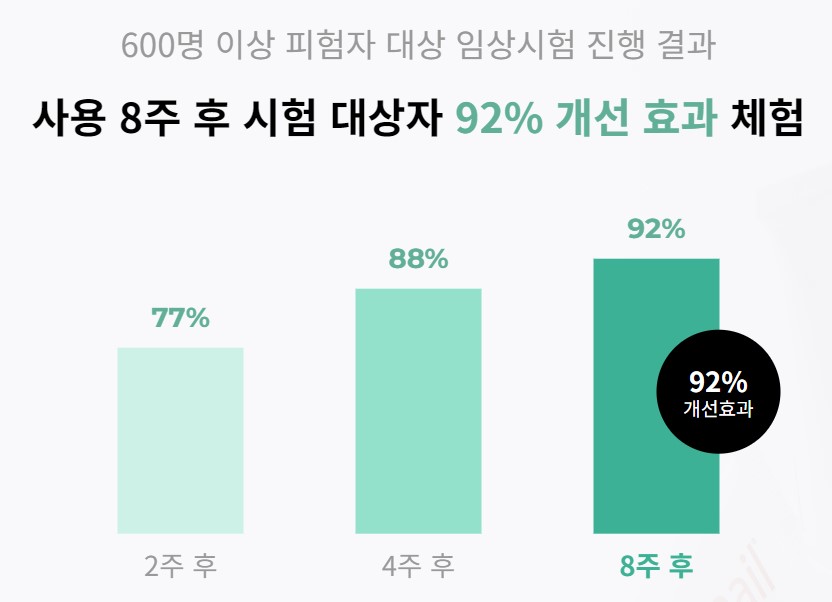 600명 이상의 참가자를 대상으로 한 임상시험 진행 결과, 사용 8주 후 시험 대상자의 92%가 개선 효과를 체험하였습니다.